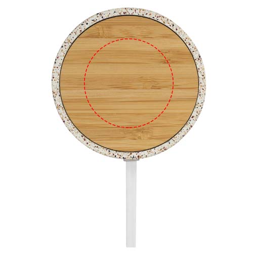 Kabelloses 10W Ladepad aus einer Kombination von natürlichem Terrazzo und Bambus. Eingebaute FOD-Sicherheitsfunktion zur Vermeidung von Brandgefahr. Kompatibel mit allen Qi-Geräten (iPhone 8 oder höher und Android Geräte, die kabelloses Laden unterstützen). Lieferung in einer Geschenkbox inklusive Bedienungsanleitung (beides aus nachhaltigen Materialien).