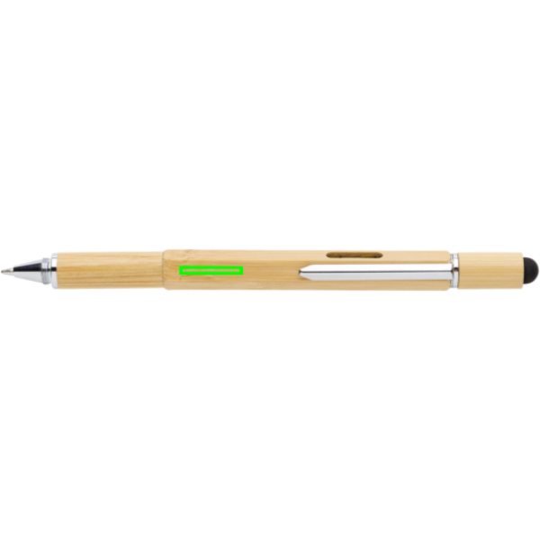 Multifunction bamboo pen with ruler (7cm) , spirit level, screw driver, stylus tip and ballpoint with blue writing ink (up to 400m) Made out of bamboo material with aluminium clip.