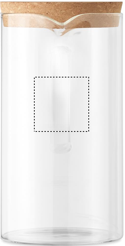 Borosilicate glass water/juice decanter with cork lid. Capacity: 1L. Cork is 100% natural material. Due to its structural nature and surface porosity the final print result per item may have deviations.