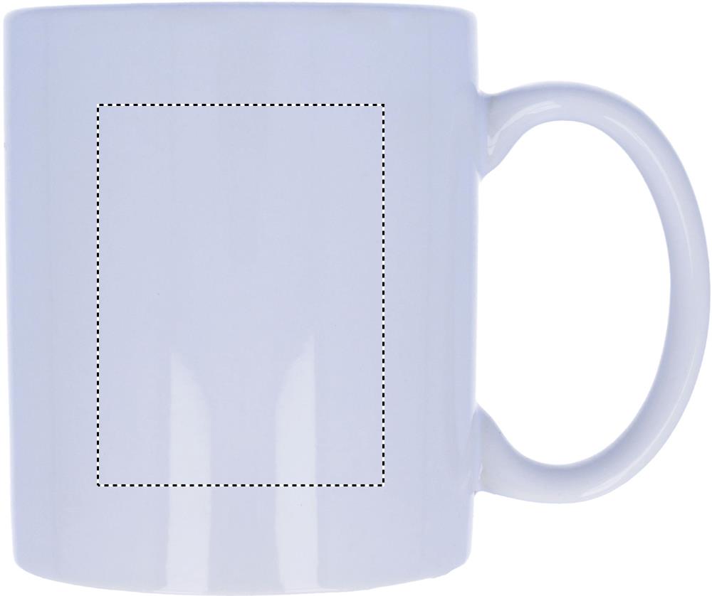 Classic cylindrical ceramic mug of 300 ml mug. Individual packaging in corrugated carton gift box. For full colour process printing, please contact us for pricing.