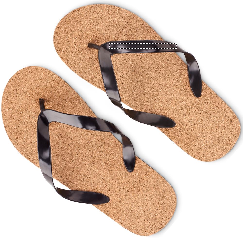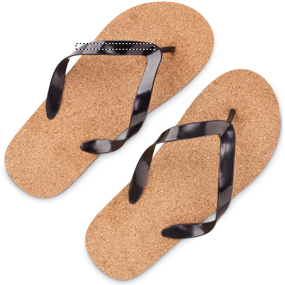 Beach slippers with cork and EVA sole and PVC straps. size M fits 36-39. Cork is a natural material, due to its structural nature and surface porosity the final print result per item may have deviations.