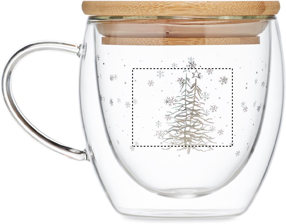 Double wall borosilicate mug with tree design and bamboo lid. Capacity: 220 ml. Bamboo is a natural product, there may be slight variations in colour and size per item, which can affect the final decoration outcome.