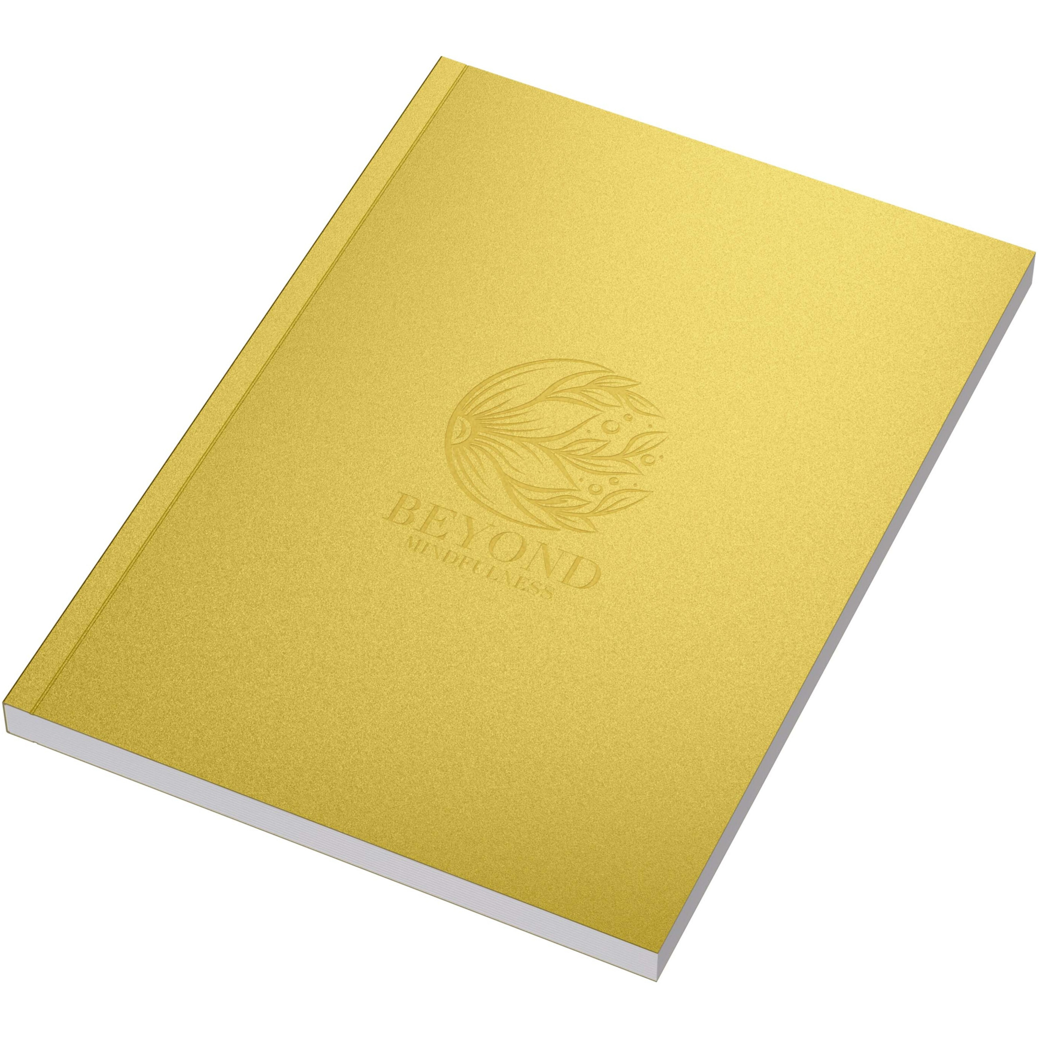 The Novella Austen A5 metallic soft cover notebook makes a fantastic stationery gift, thanks to its versatility. The notebook contains 100 sheets of 80 g/m2 paper. The sheets are plain as standard, or you can add your chosen design to the sheets, such as lines, squares or your own custom design. The metallic cover is made from 300 g/m2 card and can be printed in full-colour across the entire cover (front, back, spine). Made in the UK.