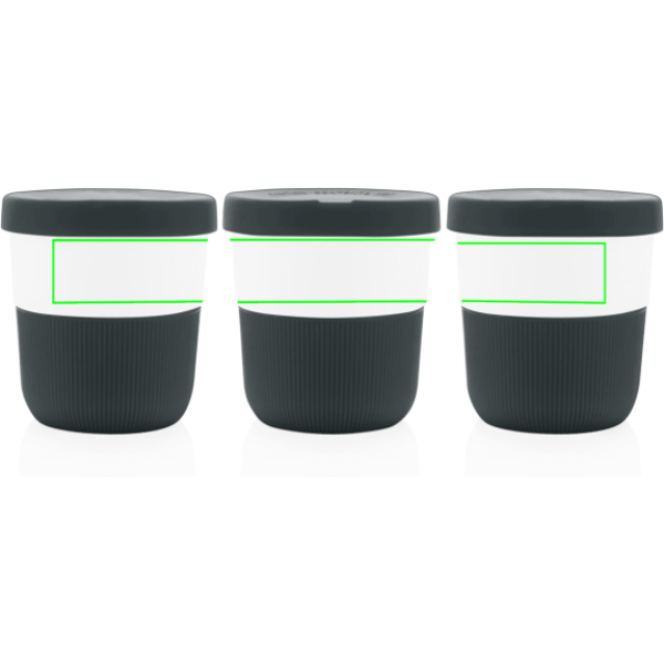 A sustainable alternative to traditional cups! Bringing style and practicality to your morning commute, this PLA coffee cup is ideal for transporting your favourite hot beverage. Manufactured from plant material (PLA), so not only stylish but also kind for the planet. Comes with a silicone grip and lid for your convenience. Fits conveniently under most coffee machines. 100% melamine free. Capacity 280ml.