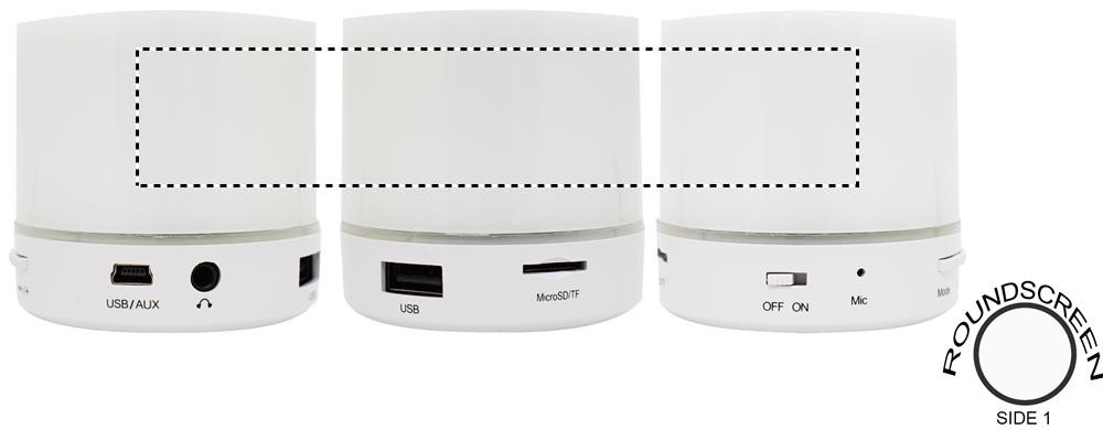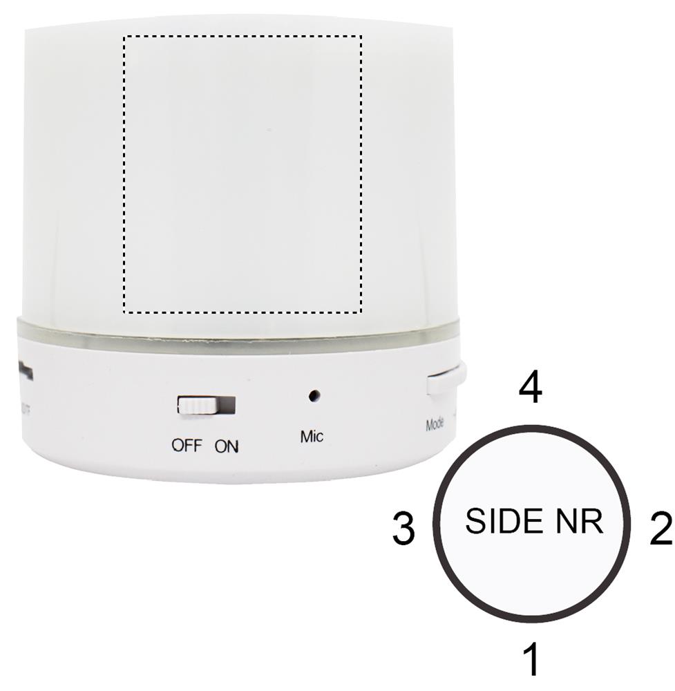 2.1 wireless speaker with LED light indication in ABS. 3 colours changing light. 1 Rechargeable Lithium 450 mAh battery included. Includes a SD card port and an AUX/ USB cable. Hands free call function. Output data: 3W, 4 Ohm. Playing time aprox. 2h.