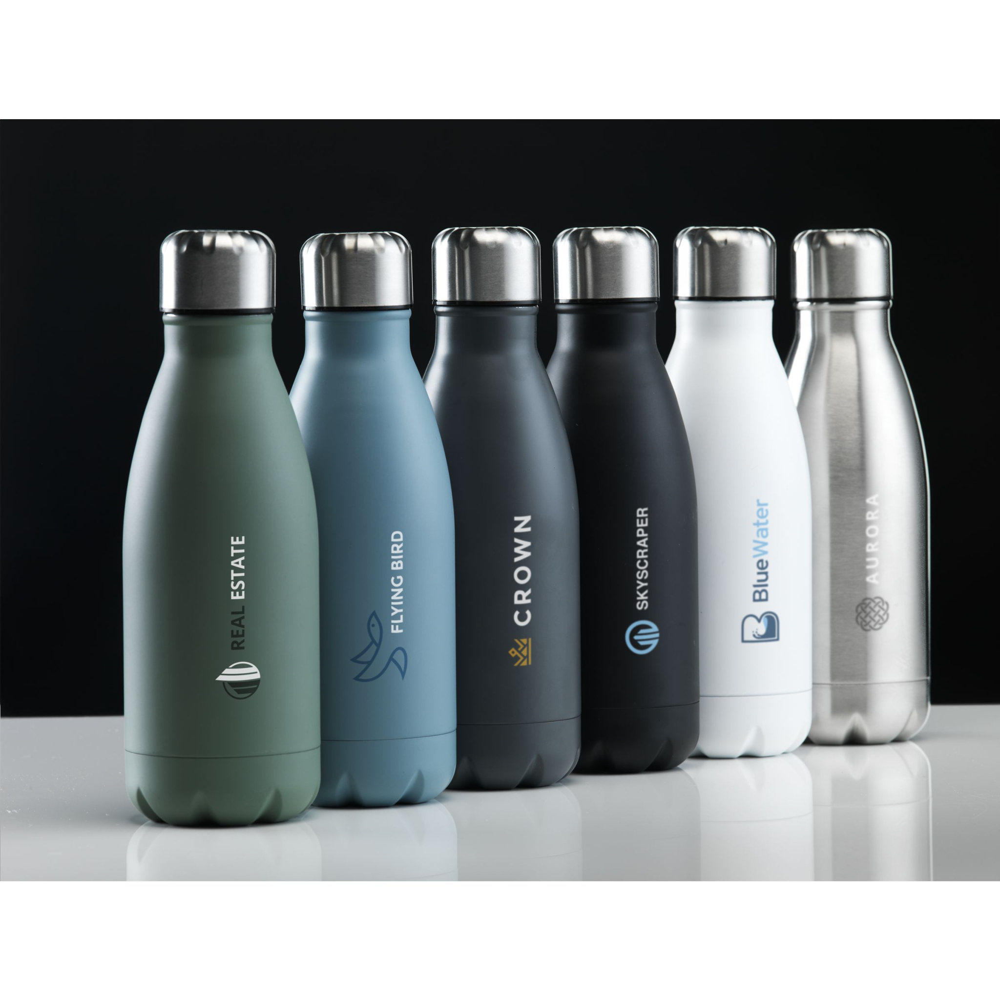 Single-walled stainless steel water bottle with leak proof screw cap. Capacity 500 ml. Each item is individually boxed.