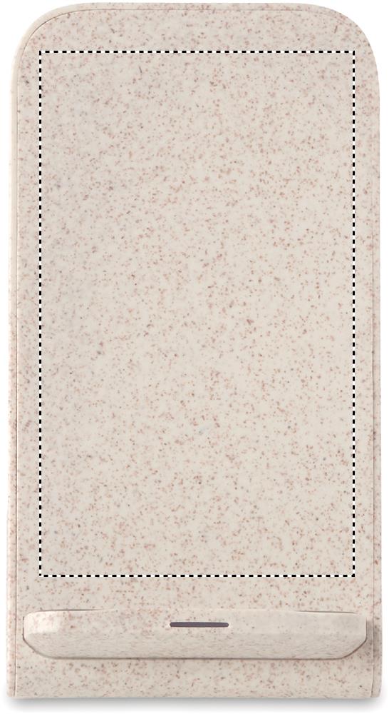 Double coil wireless charger stand. 35% wheat straw and 65% ABS. Place smartphone on it to begin charging. Output: DC5V/2A (10W) for quick charging. Compatible with latest Androids, iPhone® 8, X and newer.