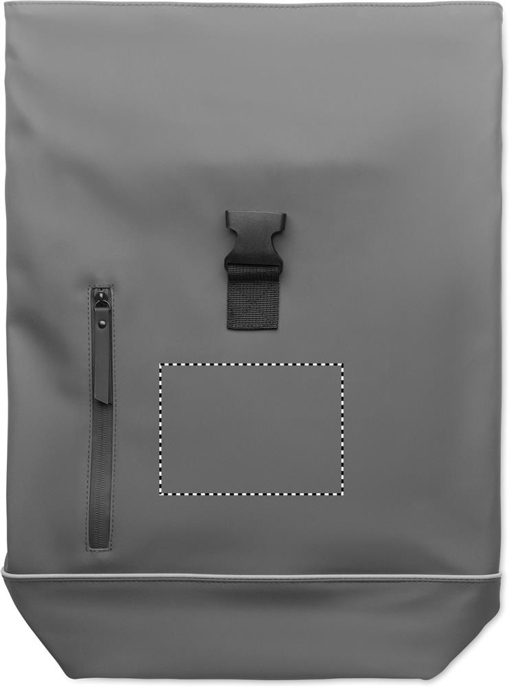 15-tolline rull-top sülearvuti seljakott pehmest PU-st polsterdatud seljaosa ja helkurribaga tugevdatud põhjaga. Veekindel lukuga esitasku. 210D RPET polüestervooder.