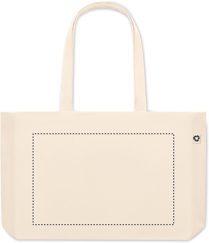 280 gr/m² kierrätetty canvas kassi, pitkillä kahvoilla ja pohja levikkeellä. Tuote on valmistettu 50% puuvillasta ja 50% kierrätetystä puuvillasta.