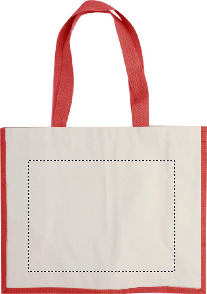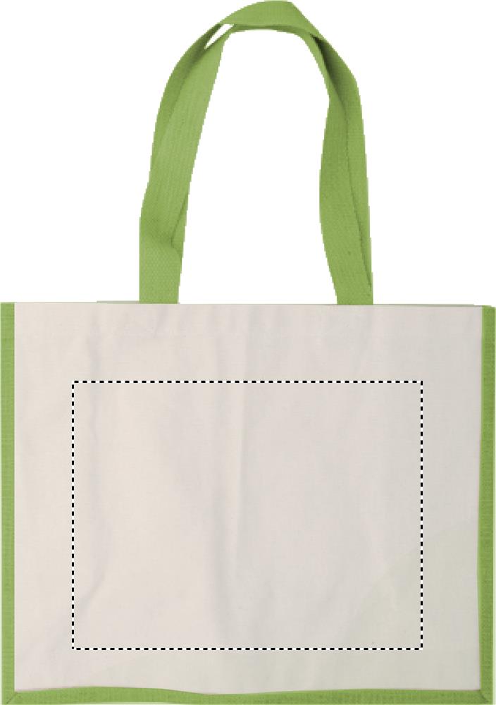 Laminoitu juuttikassi pitkillä kahvoilla, puuvilla vyötteellä ja canvas yksityiskohdilla.