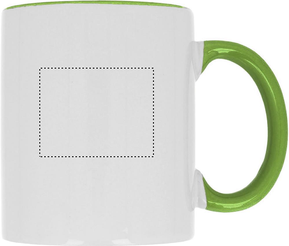 Keraaminen muki 300 ml erikoispinnoite sublimaatiota varten, värillisellä kahvalla ja sisäpuolella. Yksittäispakattuna valkoiseen pahvilaatikkoon.