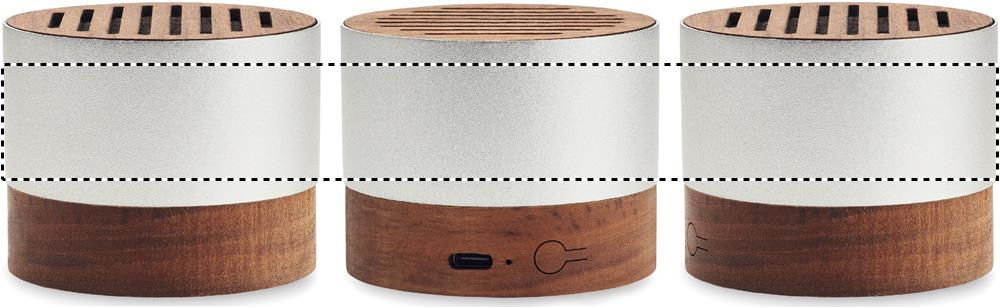 5.3 langaton kaiutin kierrätetyssä alumiinikotelossa pähkinäpohjalla ja yksityiskohdilla. Mukana 1 ladattava Li-ION 300 mAh akku. Lähtötiedot: 3W, 3 Ohm ja 5V. Peliaika n. 3h.