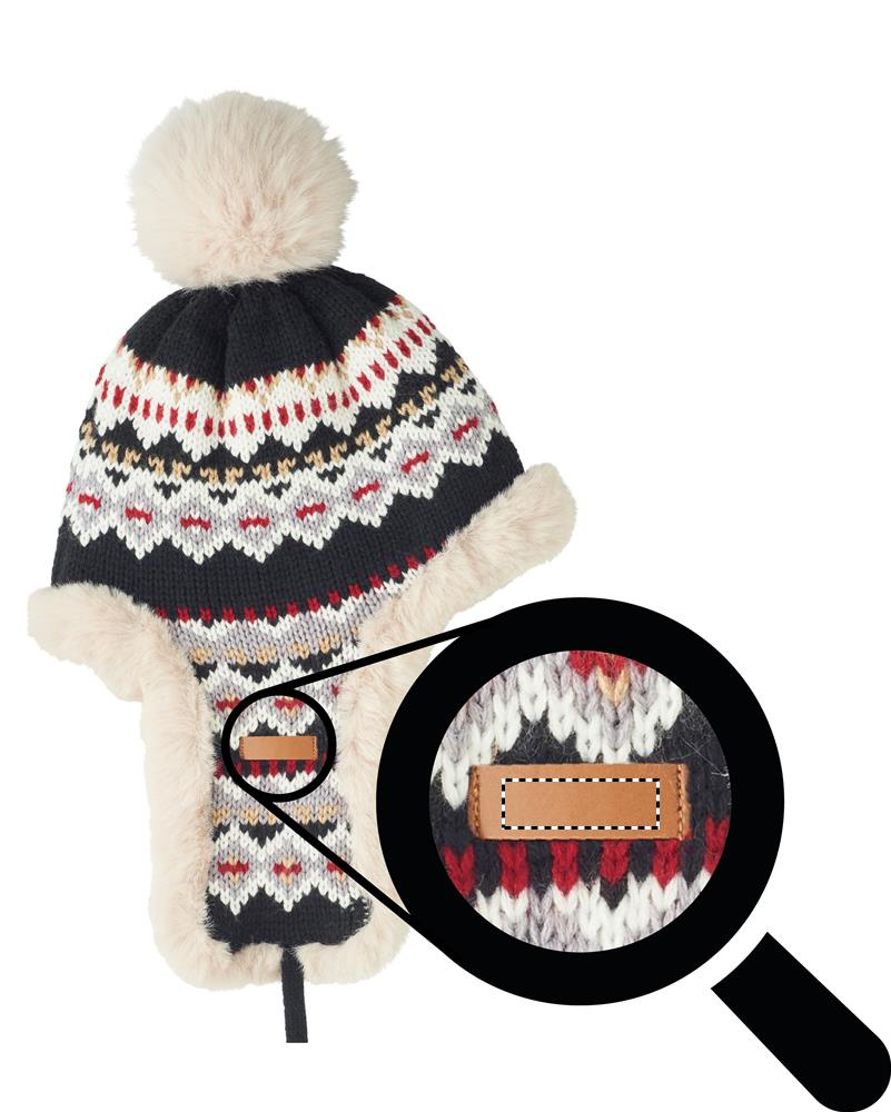 Neulottu pipo, jossa korvaläpät ja tupsu akryylikuidusta, polyesteri- ja fleecevuori. Mukana toisella puolella painatuspaikkaa varten tarkoitettu merkki. Aikuisten koko.