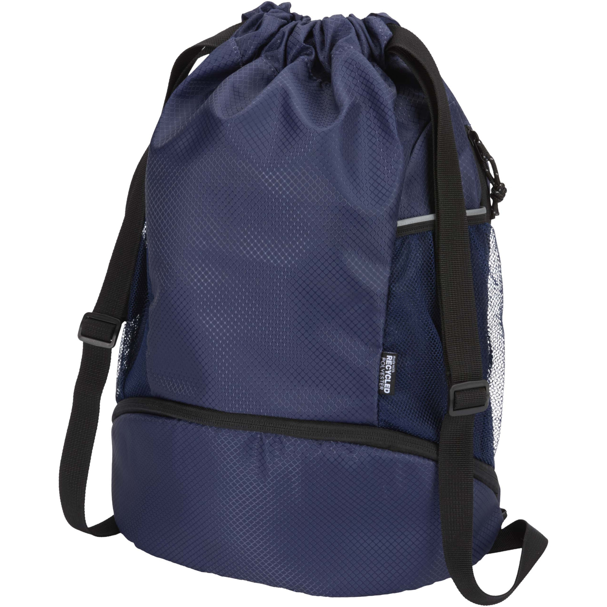 Nomad 18 litran GRS-kierrätetystä materiaalista valmistettu, kiristysnyörillä varustettu urheilukassi alalokerolla, Laivasto