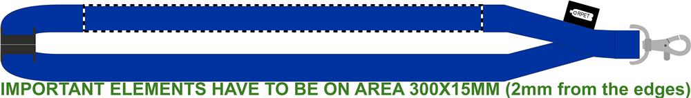 RPET-kaulanauha 20 mm leveä, metallinen koukku ja niskassa turvalukko. Sublimaatio painatus ainoastaan valkoiseen tuotteeseen.