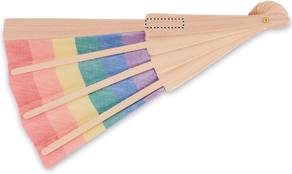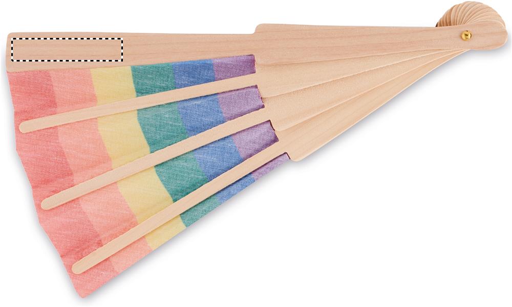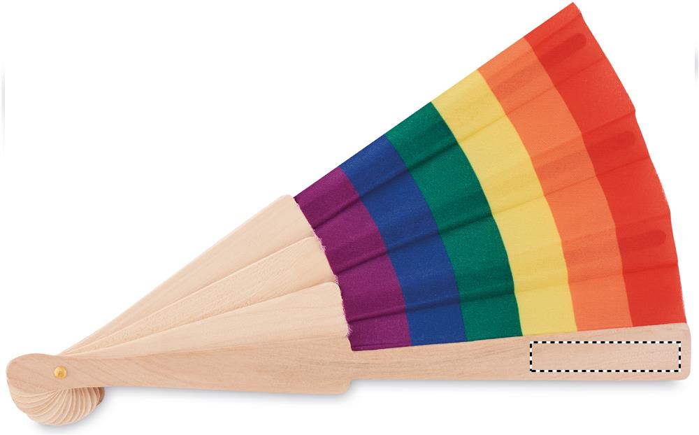 Manuaalinen polyesteeristä valmistettu satenkaaren värein koristeltu viuhka. Luonnollisen materiaalin vuoksi, tuotteiden värissä/ koossa saattaa olla erinäisyyksiä ja tämä voi vaikuttaa painatuksen lopputulokseen.