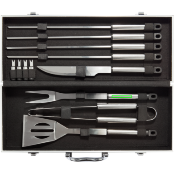 12 vnt nerūdijančio plieno kepsninių rinkinys, įskaitant 4 vnt iešmelius, drožimo peilį, 4 kukurūzų laikiklius, mentelę, drožimo šakutę su apsauginiu dangteliu ir žnyples. Supakuota aliuminio dėkle su vyriais ir rankena.
