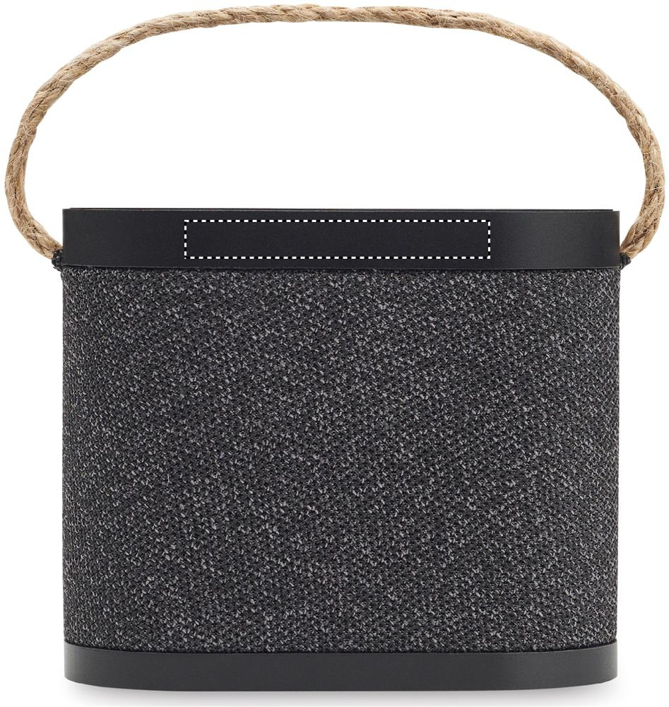 5.3 ABS bezvadu skaļrunis ar RPET poliestera auduma apdari un bambusa 15 W bezvadu lādētāja augšdaļu ar džutas rokturi. 1 Uzlādējams Li-Ion 1200 mAh akumulators. Izejas dati: 5W, 4 omi un 5 V. Spēlēšanas laiks apm. 4h.