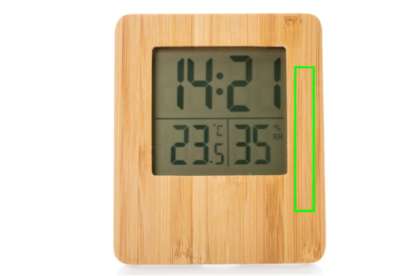 Бамбуковая метеостанция с 3 функциями: время/дата, влажность и температура в помещении. Включает 2 батарейки AAA для прямого использования. Материал бамбук и АБС. Допустимая влажность макс. 5%.