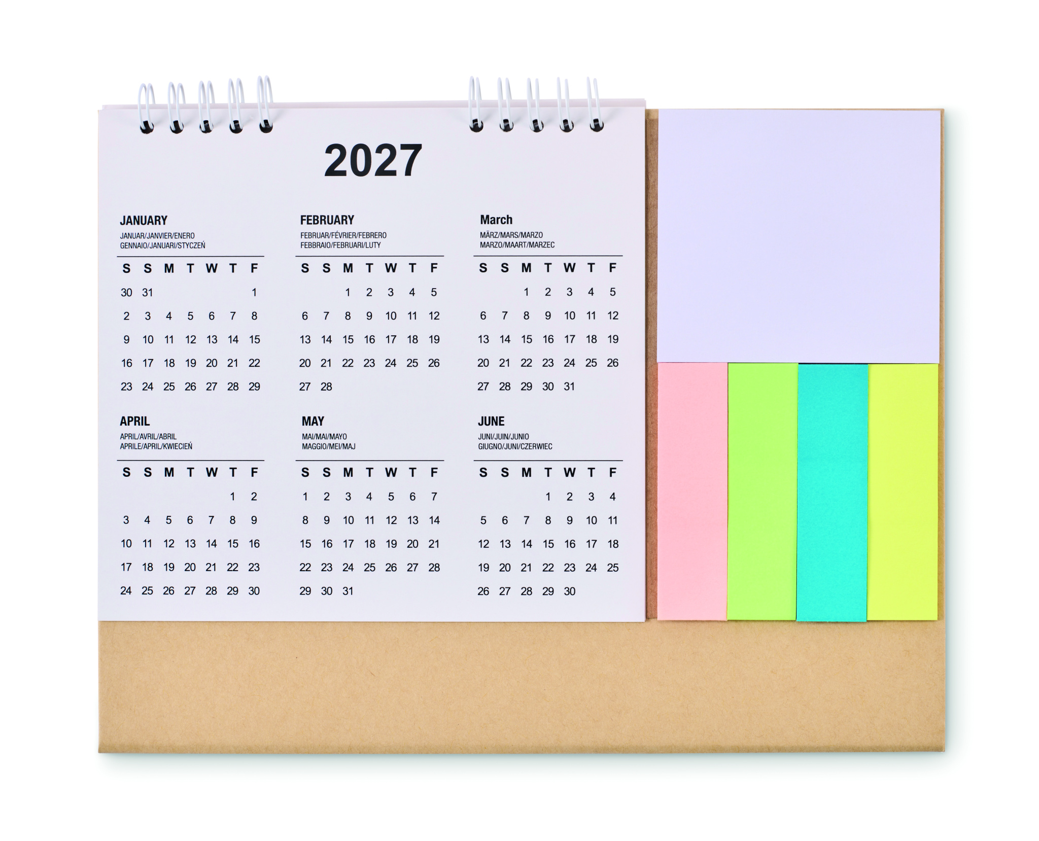 4 year desk calendar with 3-piece sticky notes and memo pad in cardboard holder. FSC®-certified | FSC MIX, P8.6, FSC-C213206