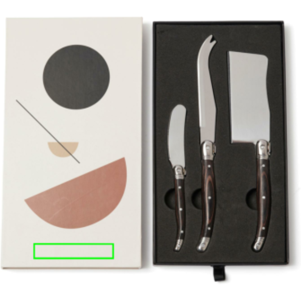 Эксклюзивный набор ножей для сыра из нержавеющей стали, состоящий из двух ножей для сыра и ножа для масла с черной ручкой из дерева пакка. Упакован в эксклюзивную подарочную коробку.