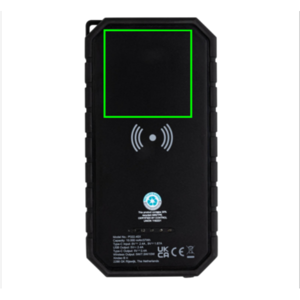 Быстрый беспроводной зарядный солнечный внешний аккумулятор емкостью 10 000 мАч мощностью 10 Вт, изготовленный из переработанного ABS и TPE, сертифицированного по стандарту RCS (Recycled Claim Standard). Общее содержание переработанных материалов: 30 % от общего веса товара. Сертификация RCS гарантирует полностью сертифицированную цепочку поставок переработанных материалов. Внешний аккумулятор поддерживает зарядку как через кабель (тип C и USB), так и через быстрое беспроводное зарядное устройство мощностью 10 Вт. Беспроводная зарядка совместима со всеми устройствами с поддержкой QI, такими как Android последнего поколения, iPhone 8 и выше. Он оснащен солнечной панелью, фонариком и карабином для крепления к любой сумке. Водонепроницаемость IPX5. С индикатором оставшегося заряда батареи. В комплект входит зарядный кабель типа C из переработанного TPE, сертифицированного по стандарту GRS. Упакован в крафт-коробку FSC® mix. Выход USB: 5 В/2,4 А; выход типа C: 5 В/2,4 А. Товар и аксессуары на 100 % не содержат ПВХ