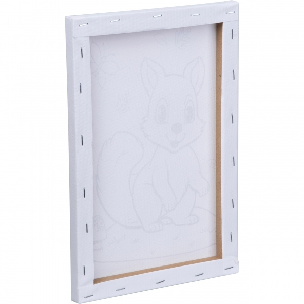 Canvastavla med träram och ekorrmotiv för målning. Fem olika färger (svart, röd, orange, gul och grön) ingår. Din logotyp appliceras på den individuella förpackningen med ett CMYK-klistermärke.