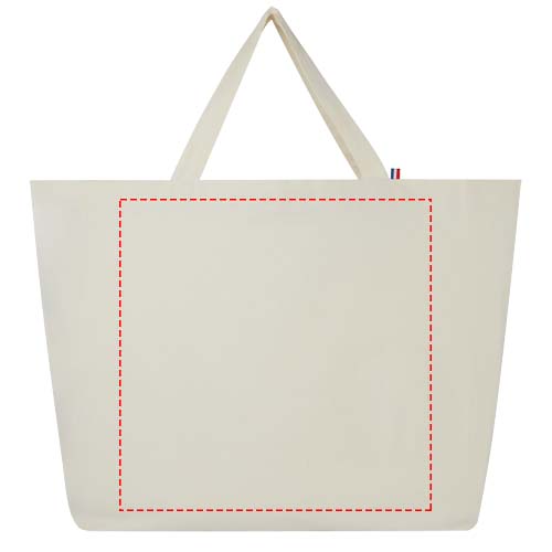 Denna tygväska med stor kapacitet är tillverkad av de finaste, 100% återvunna materialen. Den är konstruerad för att användas i vardagen och är lämplig för att bära runt tunga böcker eller matvaror. Blandningen av 200 g/m² återvunnen bomull/polyester ger hållbarhet och tillförlitlighet och gör att väskan klarar en vikt på upp till 14 kg. Garnerna har sitt ursprung i Asien men vävning, spinning och tillverkning sker i Frankrike.