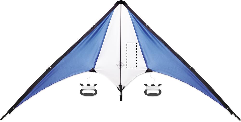 Delta formad kite drake i 210T Ripstop polyester med två linor med handtag. Kommer i polyester påse.