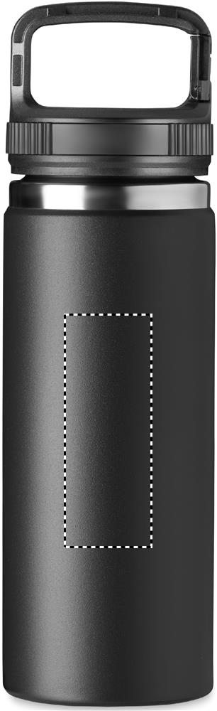 Termoflaska i rostfritt stål med dubbelvägg och krokhängare på locket. Kapacitet: 500 ml för varma eller kalla drycker.