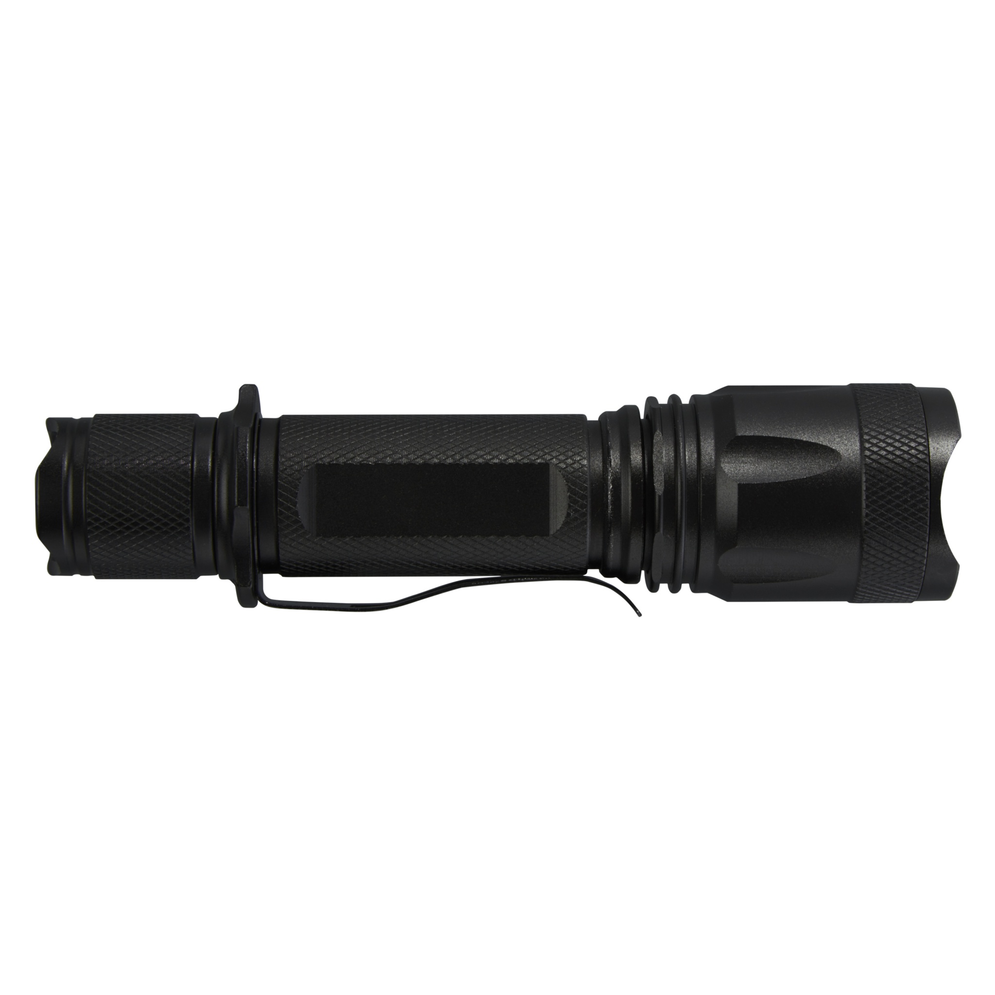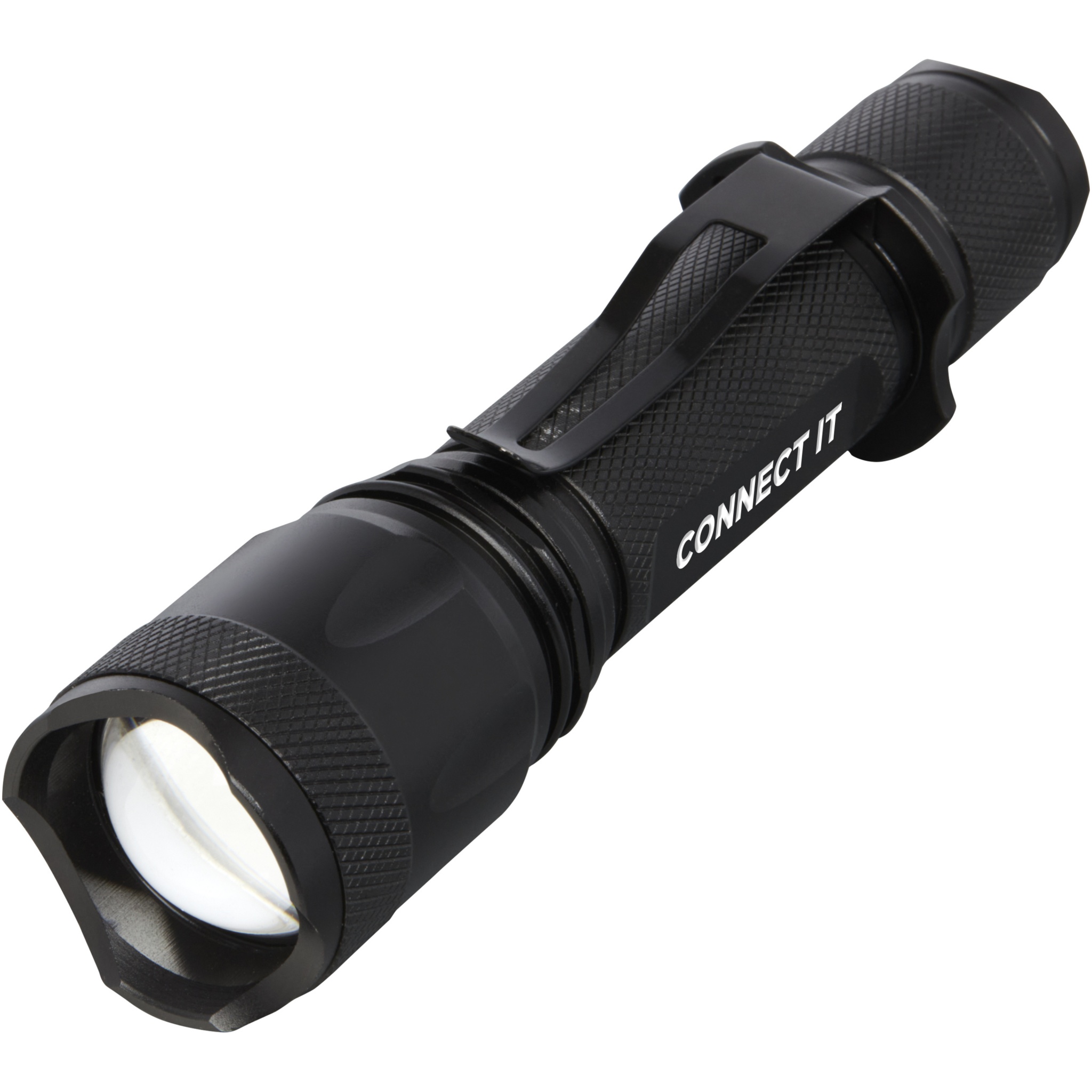 Få aldrig slut på batteriet med denna laddningsbara taktiska aluminiumficklampa med hög effekt. Det solida svarta legeringshöljet i aluminium erbjuder ett taktiskt utseende med en slagtålighet på 1 meter. Ficklampan har en bältesklämma för enkel bärning och den är stänkskyddad med en IPX4-klassificering. Lysdioden på 5 W genererar 300 lumen i upp till 3 timmar och har ett strålavstånd på 200 meter med 5 olika ljuslägen: högt, medium, lågt, strålkastarljus och SOS. Den höga effekten kommer från ett inbyggt litiumbatteri med en kapacitet på 2 000 mAh. Ficklampan har en storlek på 14,5 x 3,4 cm och väger bara 170 gram. Levereras med en bruksanvisning och är förpackad i en återvunnen presentförpackning av kartong med en storlek på 17,5 x 6 x 4 cm. Gravyr på aluminiumkroppen rekommenderas.