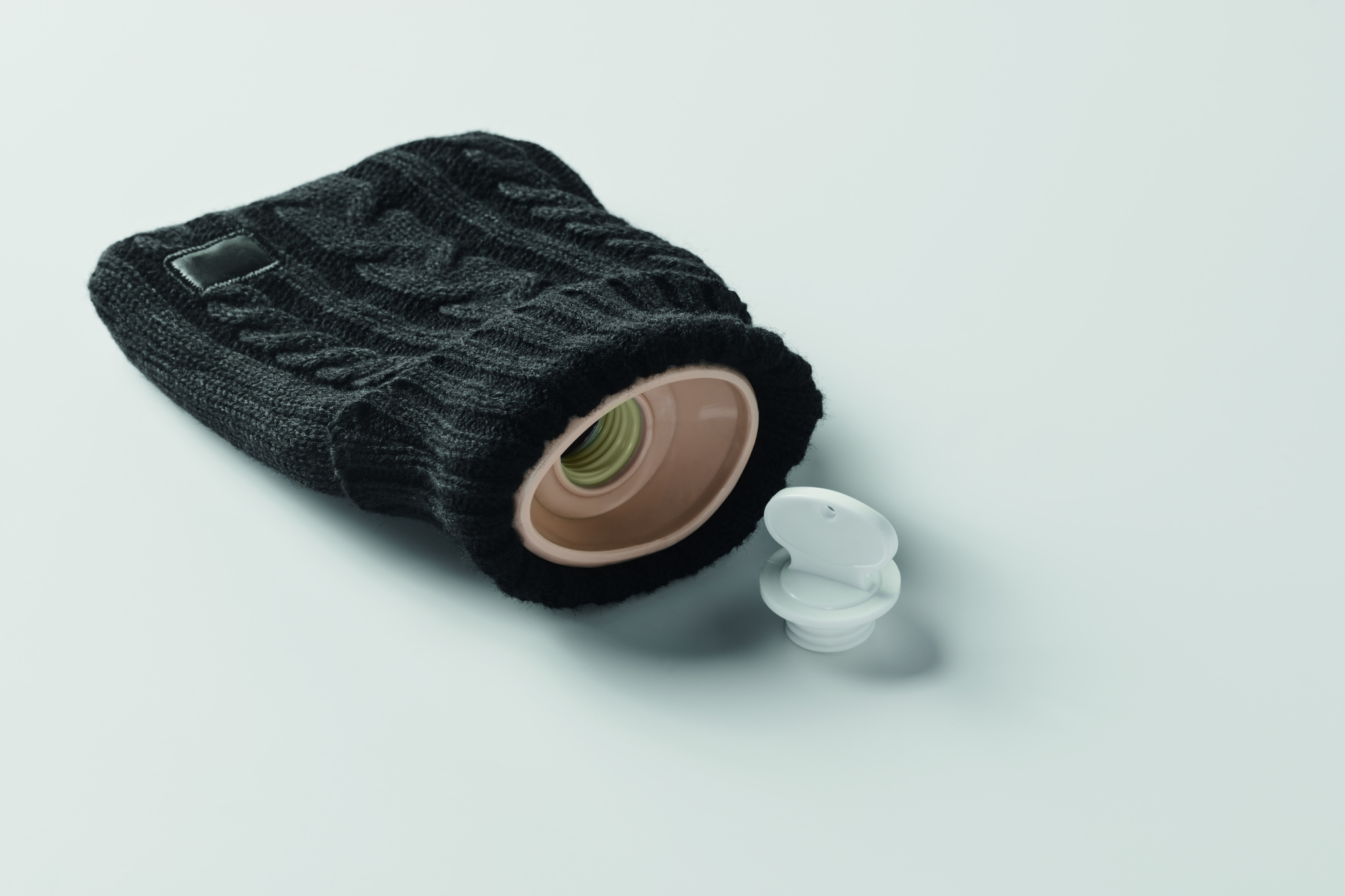 Varmvattenflaska med stickad påse i akryl. Används för att ge värme, vanligtvis i sängen, men även för att tillföra värme till en specifik del av kroppen. Volym: 450 ml.